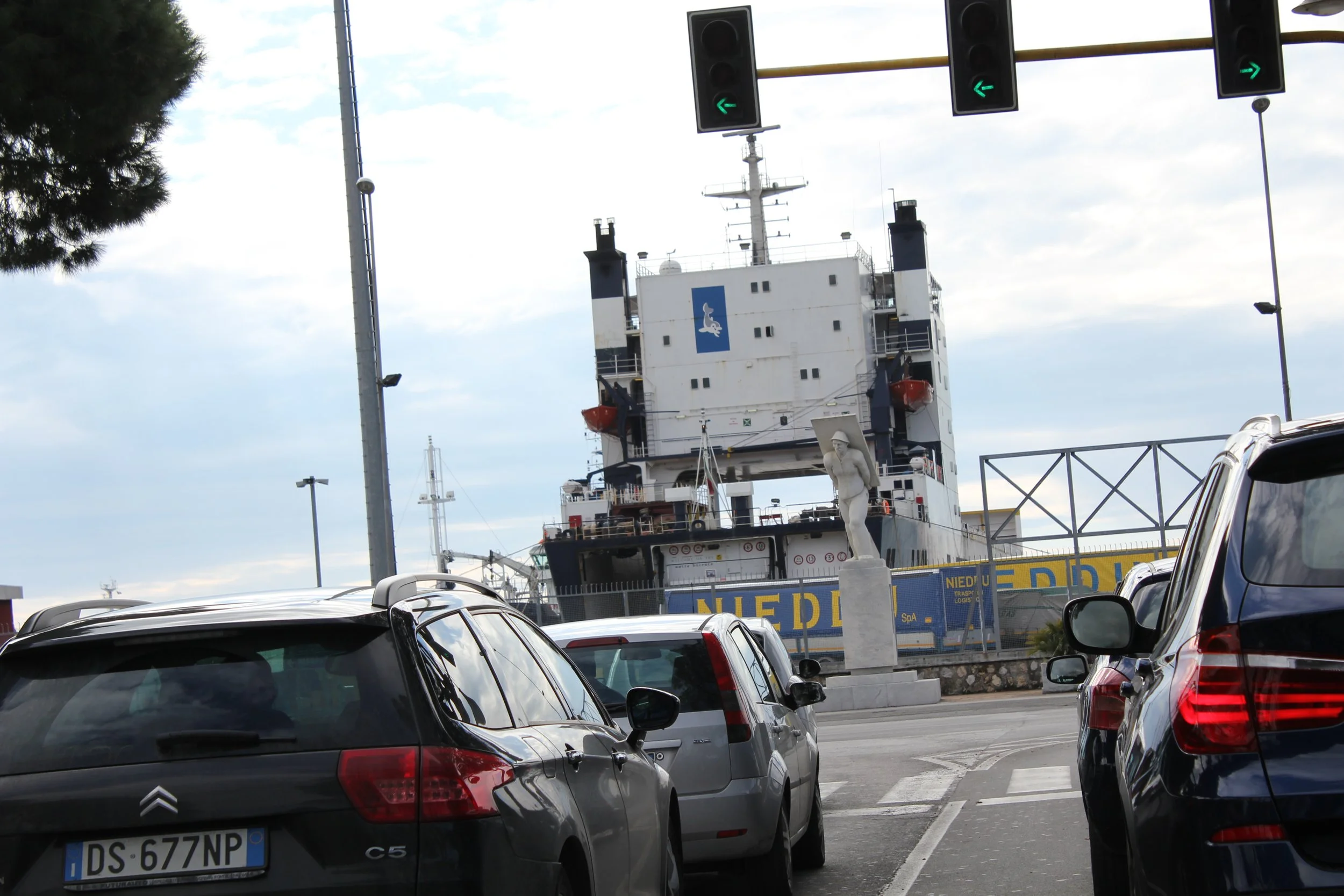 aankomst bij haven vanuit een rijdende auto